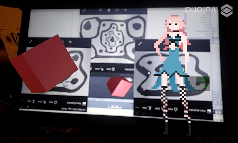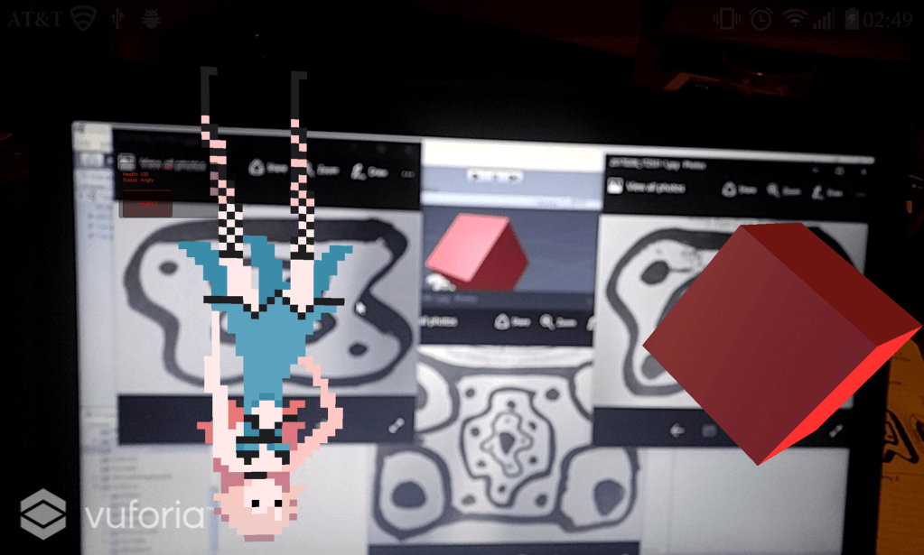Lens of Truth and Tabletop VR/AR – A small project to incorporate hidden information and data into a tabletop environment. Combining Unity, Vuforia, Android OS, and image recognition, the project read special images to populate the screen with either: 1) a rotating 3D object that will change rotation upon interaction, 2) a certain pixel character with statistical information relating to the image, 3) a hidden message and or image.