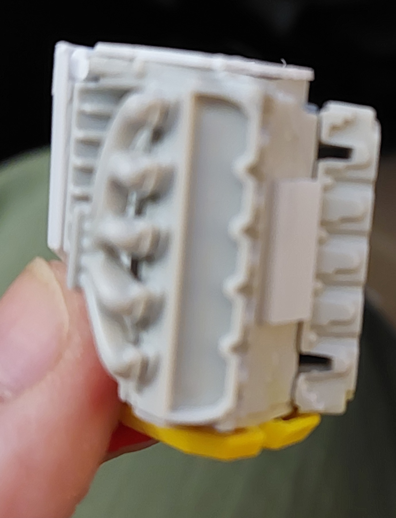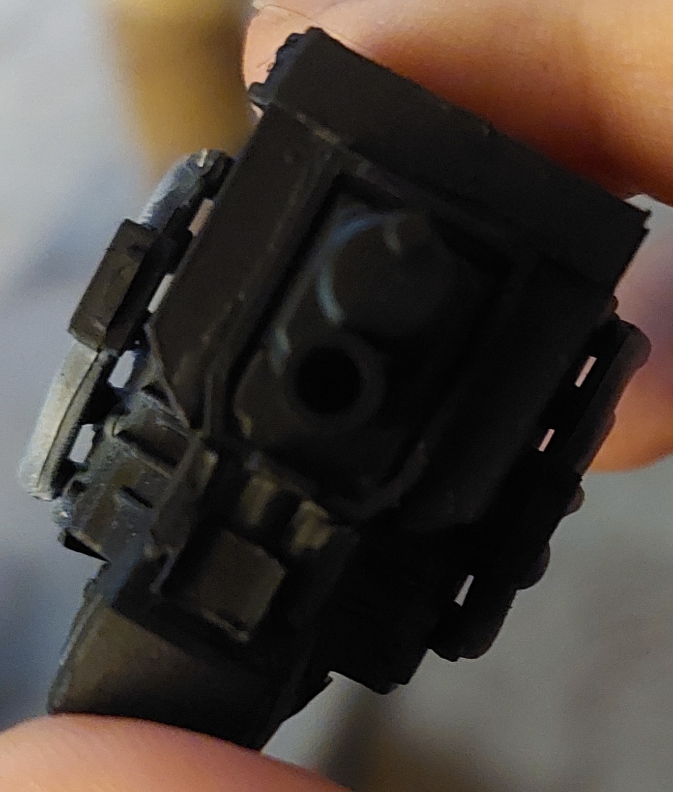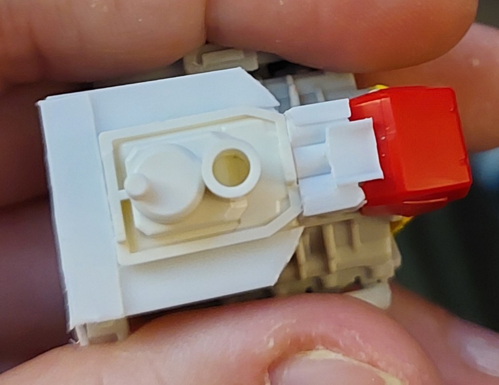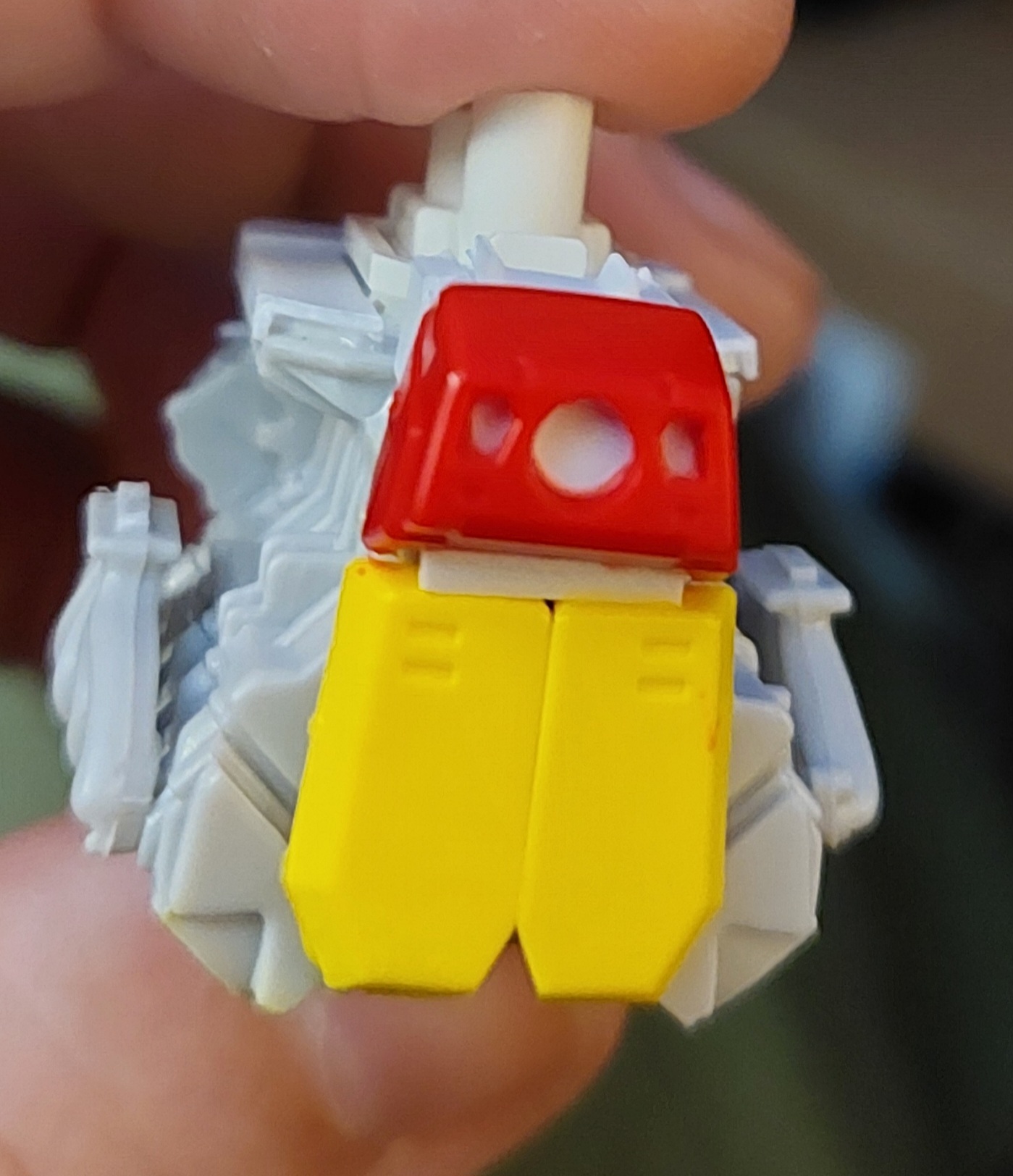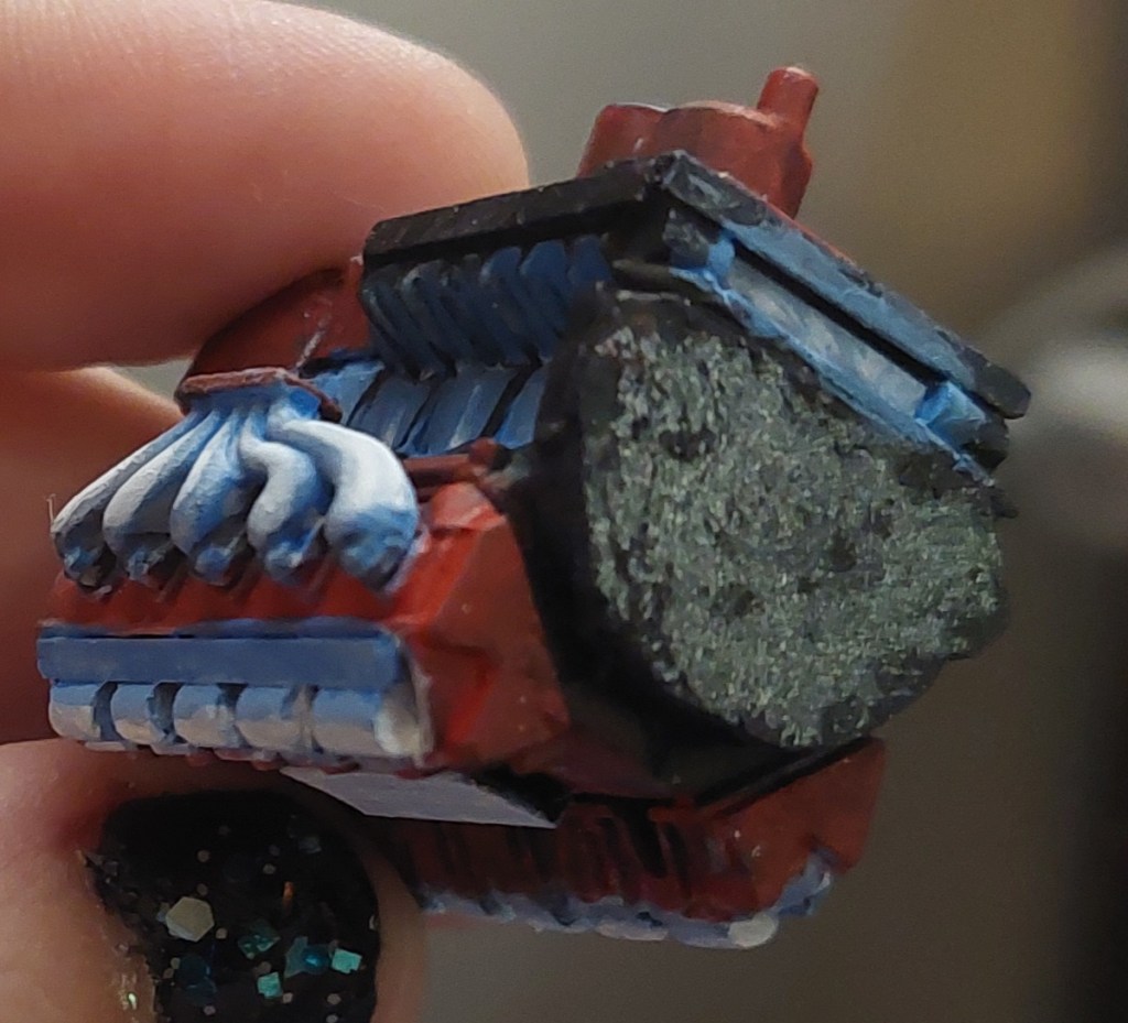 However the pieces of the engine were missing and to replicate the feel of a spaceship I needed to bulk out and find to fix the silhouette of the ship. To do this I attached some Bandai Gundam model kit piece. These would serve as the front of the ship and the smokestack. The hope being this would give the appearance the ship is majority engine giving its the ability to tow larger ships it encounters with ease.