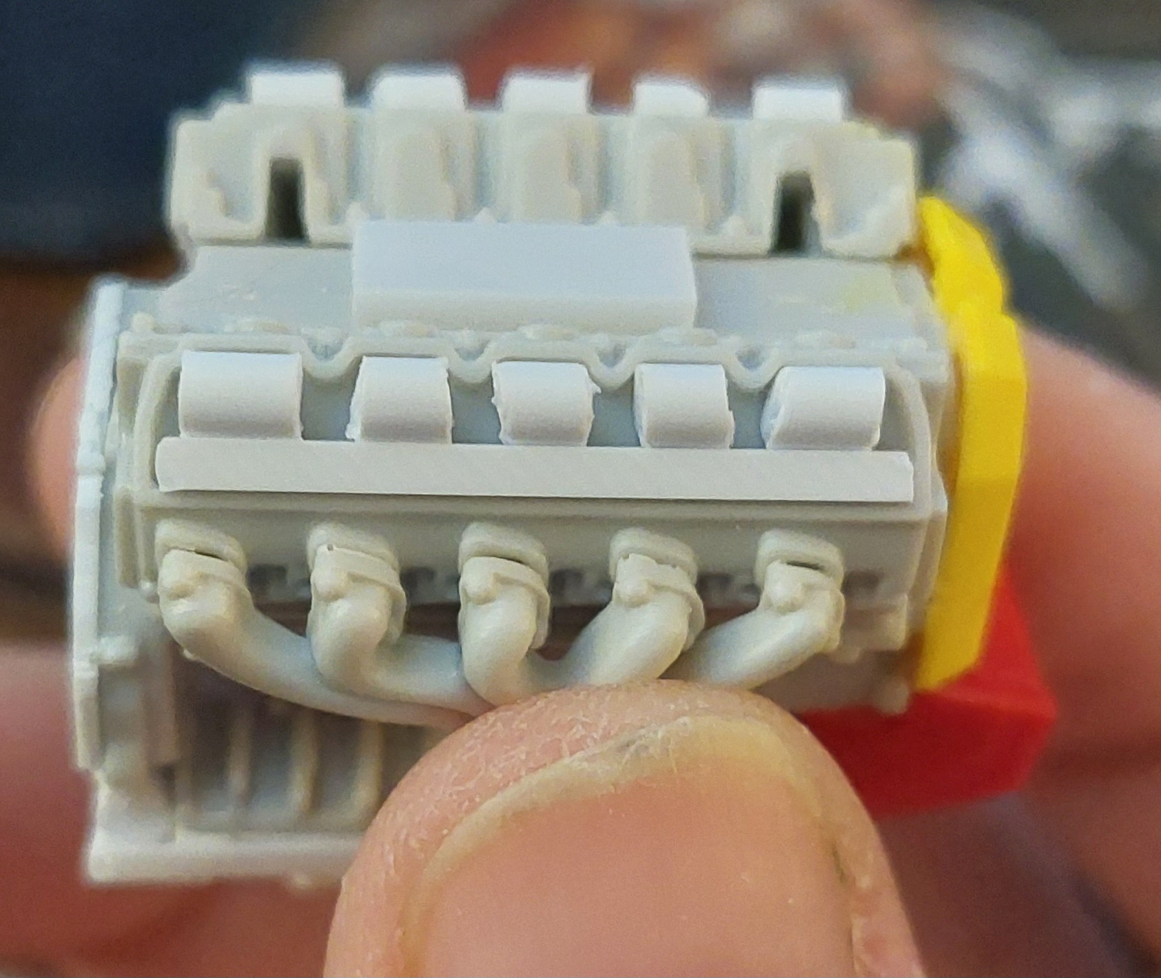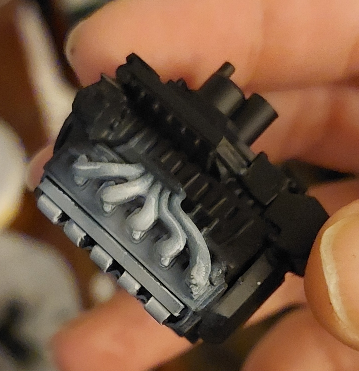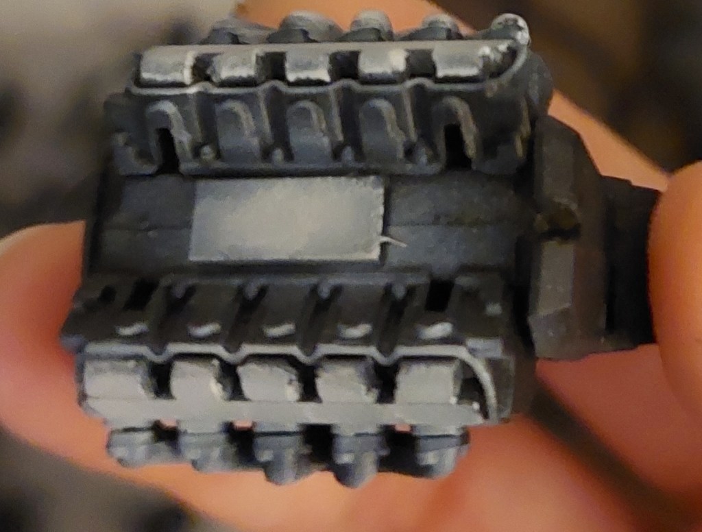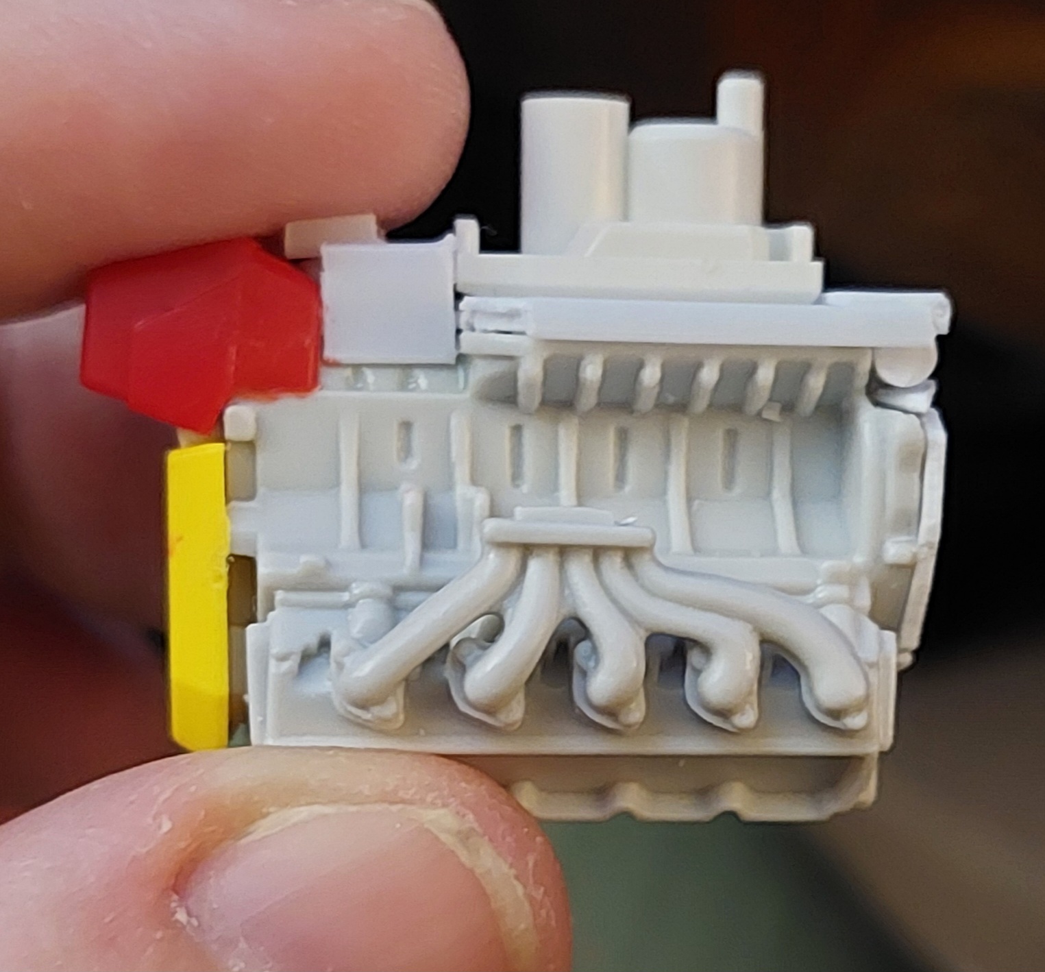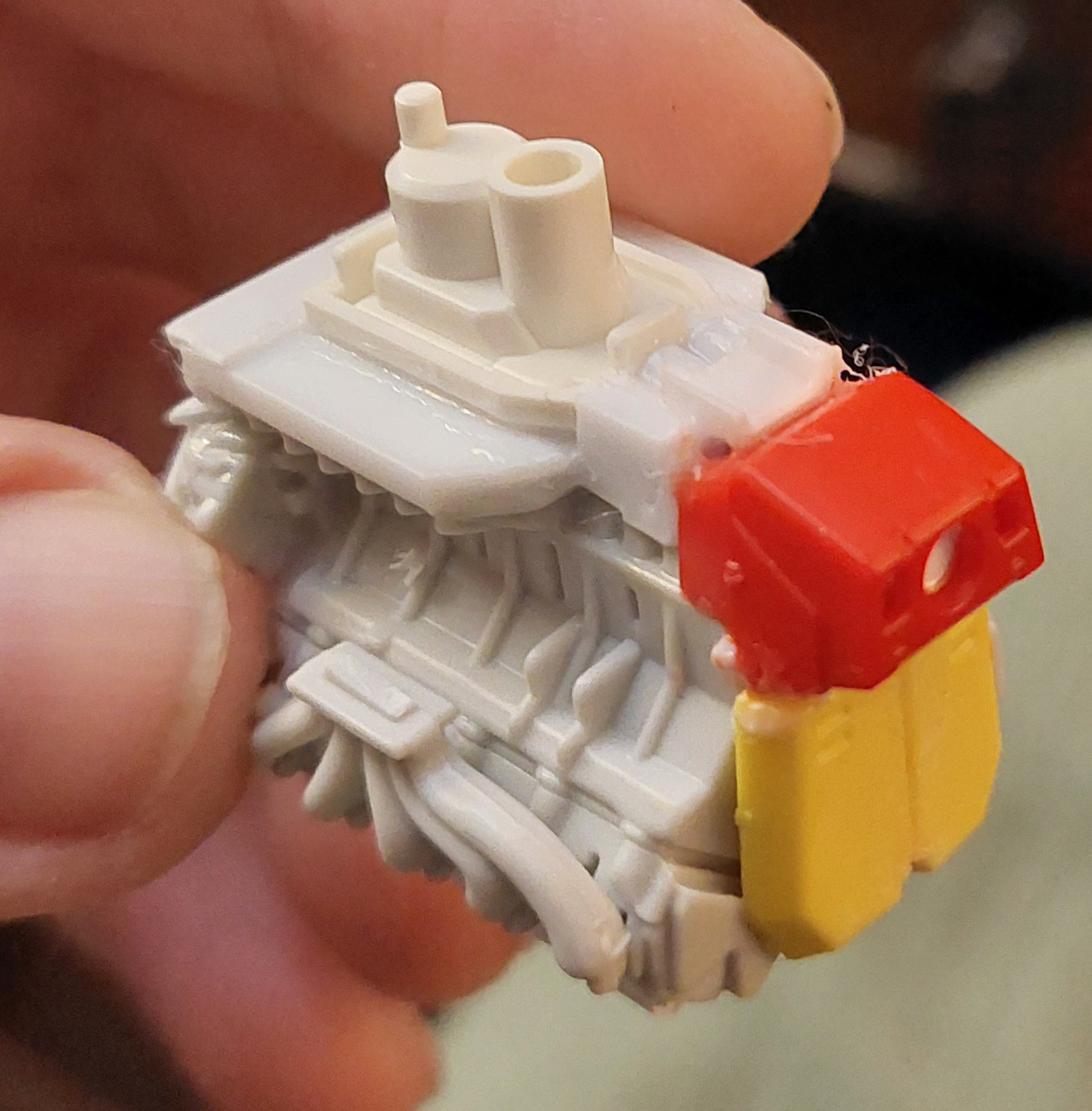 The start of the space tug was the result of finding a fun engine component from a model car and seeing in it a space ship. Unlike other kitbashing projects the Space Tug is a scratch bash. Instead of taking material form a model kit and modifying it to make a new project, a scratch bash is a type of model construction that taking left over pieces from kits and uses them to make a new object. While similar the spirit of a kitbash is to try to use one kit as an anchor for the project while scratch basing has no such anchor point.