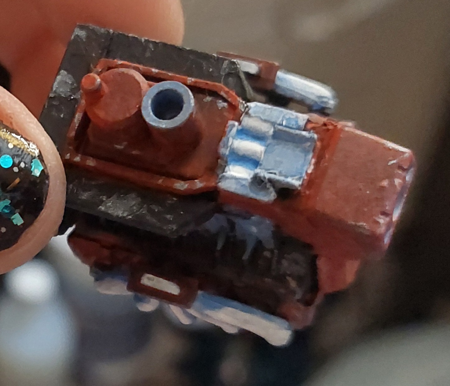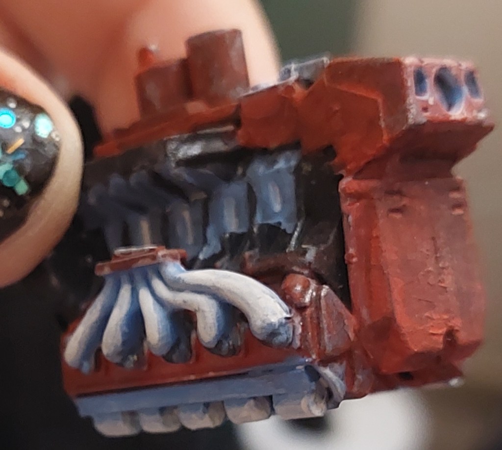 After this I base coated the ship in black with white highlights for areas where the heat of the engine illuminate the metal. Finally giving it a base black and red color, using white and blue to signify hot spots on the ship, and chipping the paint with metallic grey paint.